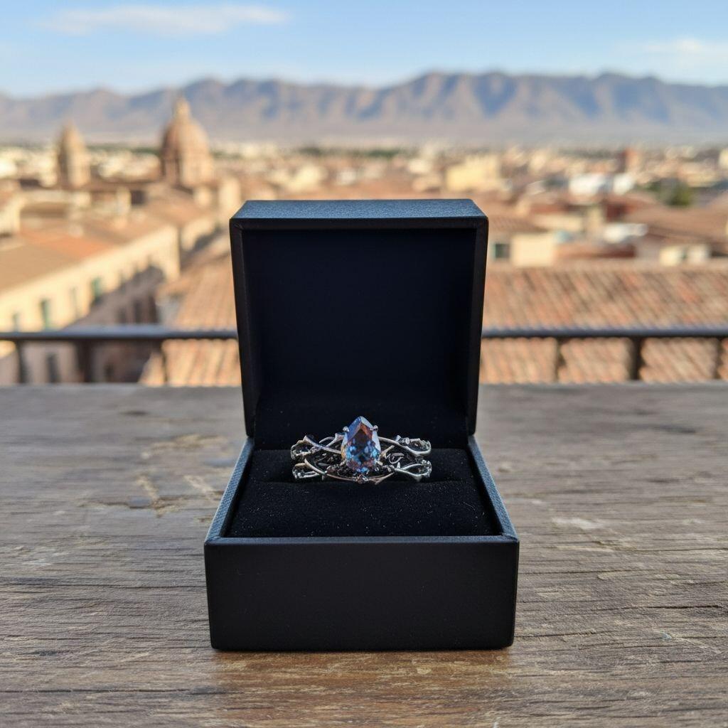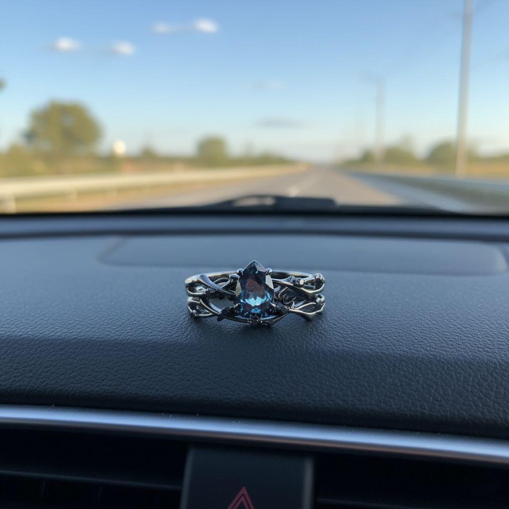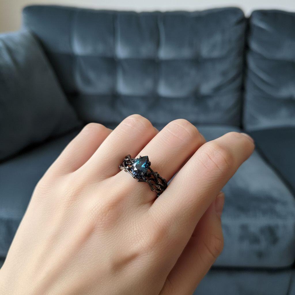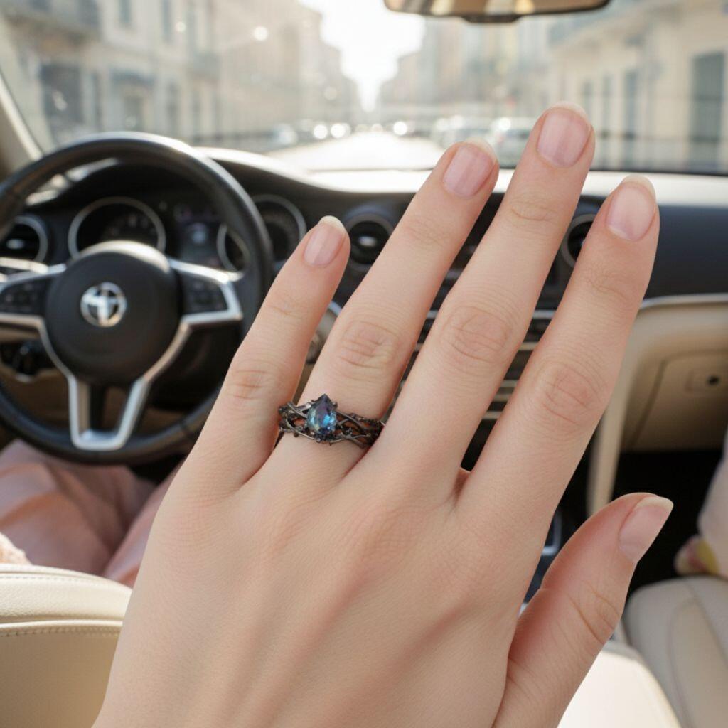 • - Design: Intertwining vine band cradling a dewdrop-like gemstone